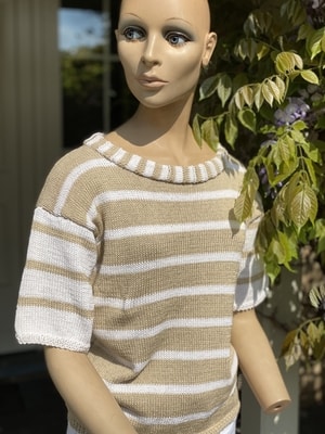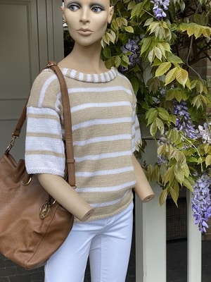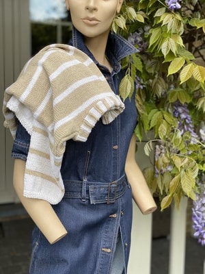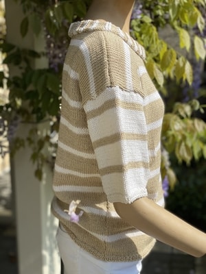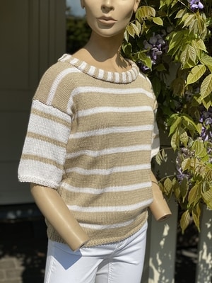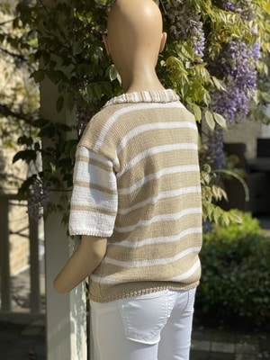 Dit is een leuke handgebreide trui om je lente en zomer mee op te fleuren. De afwisseling van beige en witte strepen maakt van dit kledingstuk een eyecatcher . Zeker de hals doet met zijn unieke opbouw de trui stralen. Deze neutrale kleuren laten zich met bijna alles combineren. Eigenschappen van Cotton – cashmere zorgen voor een aangenaam en koel gevoel bij warme temperaturen.