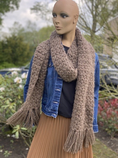 Superwarme bruine sjaal met lichtgrijze nuances in de wol. Gehaakt met Drops Air MIX voor dat onbeschrijflijk cosy gevoel. Het jasmijn patroon geeft aan dit project de nodige vrolijkheid. Omdat de sjaal lang is kan je die op verschillende manieren dragen. Lekker los of nonchalant over de schouder, rondom rond voor een sportieve look. Of je nu een lange mantel of een kort sportief jasje aandoet dit is een leuke accessoire die zich makkelijk laat combineren.